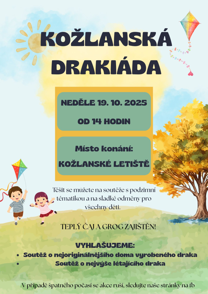 Pouštění draků. Soutěže s podzimní tématikou pro děti. Sladké odměny pro všechny děti. Občerstvení v podobě teplého čaje a grogu pro dospělé zajištěno.